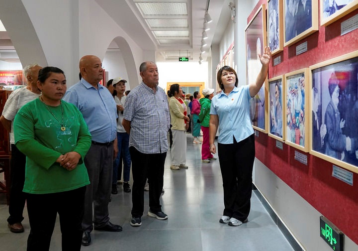 在新疆和田地区于田县库尔班·吐鲁木纪念馆,如克亚木·麦提赛地(右一)向参观者介绍展出的照片(2025年9月14日摄)。新华社记者 丁磊 摄