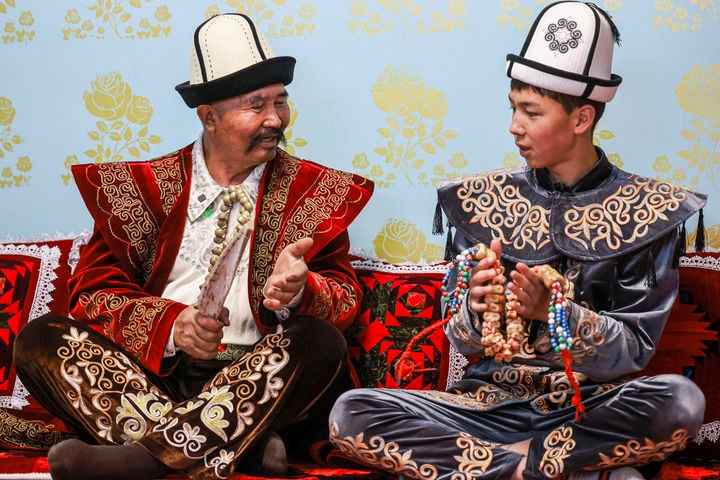 《玛纳斯》国家级非物质文化遗产代表性传承人江努日·图日干巴依(左)教徒弟演唱《玛纳斯》(2025年4月21日摄)。新华社记者 王菲 摄