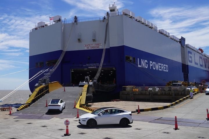 2025年7月2日,在上海自贸试验区临港新片区南港码头,一批新能源汽车驶向一艘滚装货轮。新华社记者 杨有宗 摄